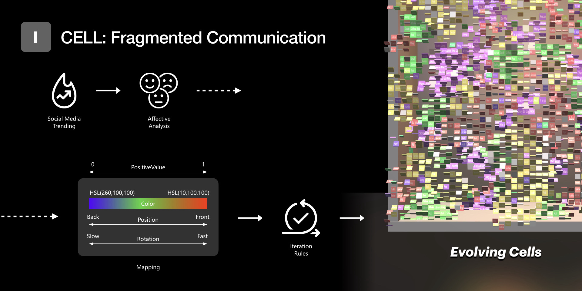 The evolutionary behavior of cellular automata can be classified into four artistic properties: homogeneous, periodic, chaos and edge of chaos. From the social media trending, topic and content of the posts and top comments are crawled in real time and sentimental tendency of each post is calculated. The sentimental value as well as the hot value and rank index from the trending data are integrated as parameters into the iteration rules of the cellular automata. Cells in the automata represent individuals browsing social media. They behave differently in each generation as the sensibility of each cell is influenced by the parameters above and the distribution of topics is changing according to the cells’ behavior. The color, floating position and rotating movements mapped from sentimental tendency indicate active state of each cell. The distribution of gradient light and shadow of the space infers the overall state of the trending. This layer of iterating cellular automata maps to the macro phenomenon of fragmented communication of individuals in social media.