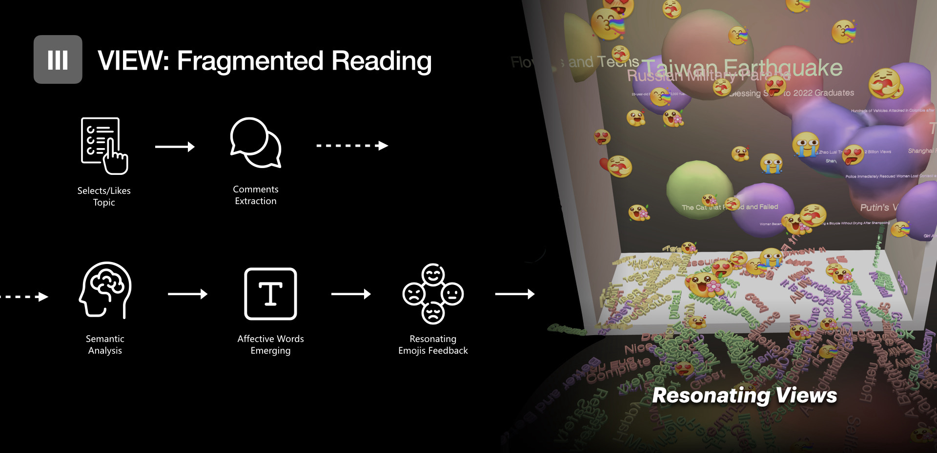 Affective words and emojis are extracted from the comments of trending posts using lexical and semantic analysis. As the user dives deeper into the content of the trending topics and interacts with them, affective words fall out of the topic bubbles and accumulate in the space naturally. Furthermore, if the user clicks the like button of a certain topic, which indicates that the user somehow endorses the content, emojis stickers extracted from the corresponding comments scatter in the design space and the sensibility of the cells possessing the topic is enlarged in the first layer of cellular automata. The semantic information exhibits phenomenon of fusion and disappearance of different information in reading fragmentation. And the sentimental feedback helps to arouse resonance from personalized generative art, which further stimulates behavioral reflection after the interaction experience.