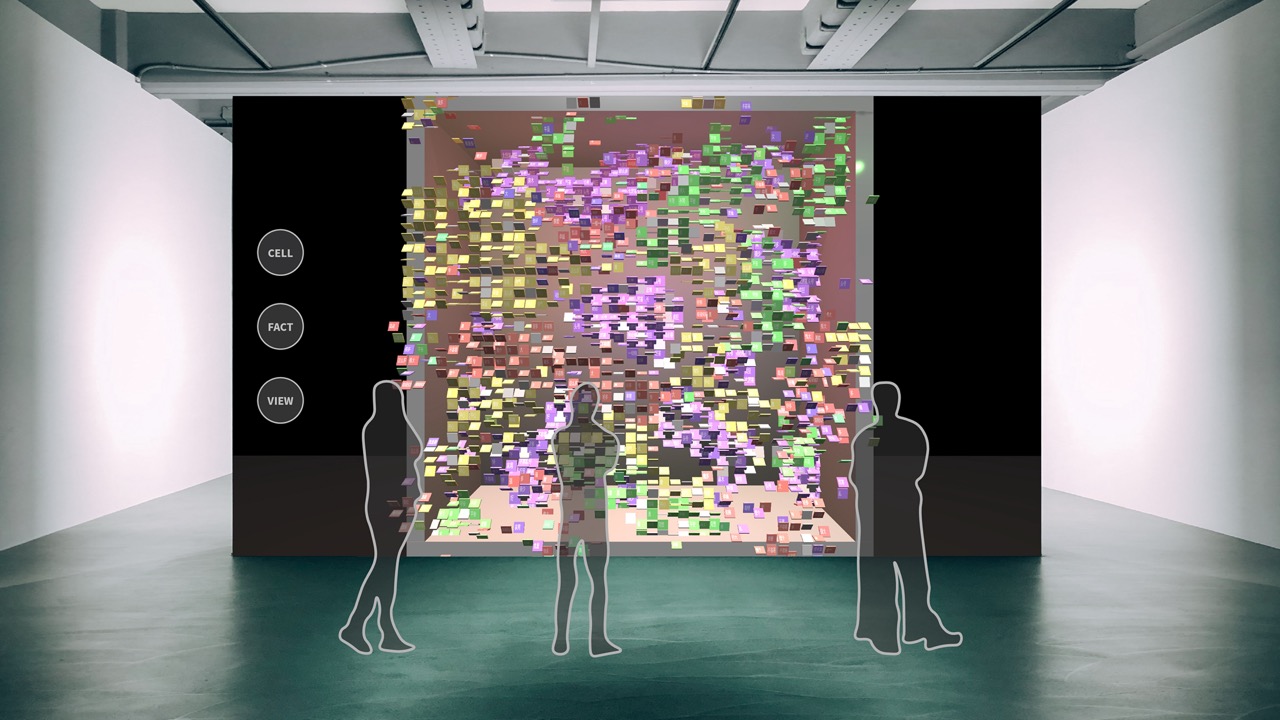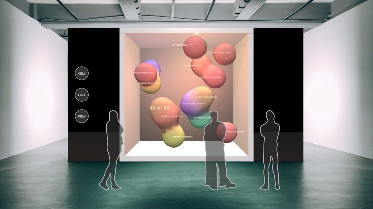 Entering the second layer, discrete cells from the automata cluster into topic bubbles, the positions of each topic bubble are calculated from the overall distribution of cells possessing each topic and are constantly wandering in the space. The blending feature of bubbles and lightings expresses the mechanism of forgetting and repression in the mental storage capacity model, creating the art of topic competition and information anxiety. This layer of bubbles fuses and clusters into each other maps to the memory system activation mechanism and fragmented thinking process in each individuals’ mind.