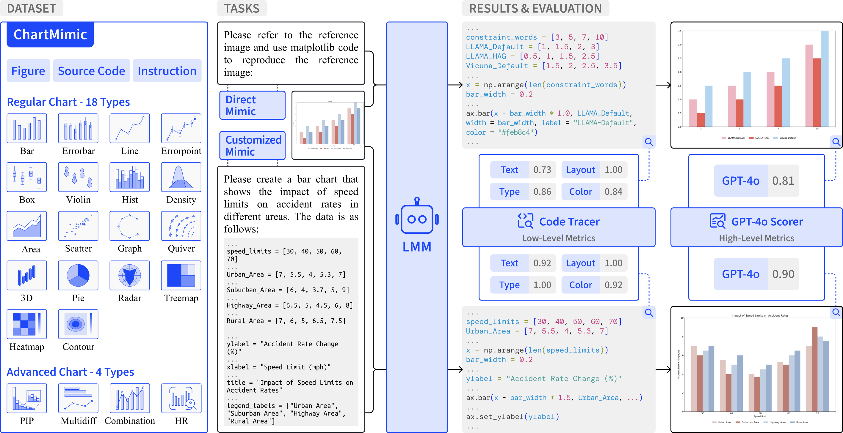 The evaluation of 3 proprietary models and 11 open-weight models highlights the substantial challenges posed by ChartMimic. Even the advanced GPT-4o, InternVL2-Llama3-76B only achieve an average score of 82.2 and 61.6, respectively, indicating significant room for improvement. We anticipate that ChartMimic will inspire the development of LMMs, advancing the pursuit of artificial general intelligence.