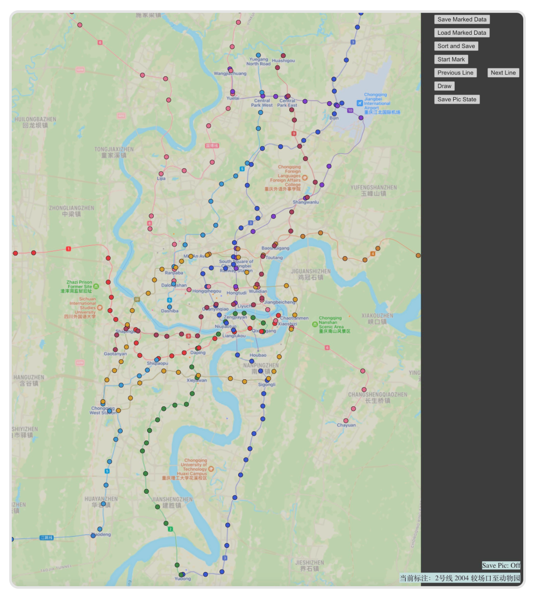 In the labeling process, the user clicks on a subway station on the map, and the program temporarily stores the station's coordinate information. The user can switch between the current annotated lines forwards or backwards until all lines have been annotated. After completing the labeling, the user can visualize the annotated data on the map and export it as a JSON file of the city's subway lines data.