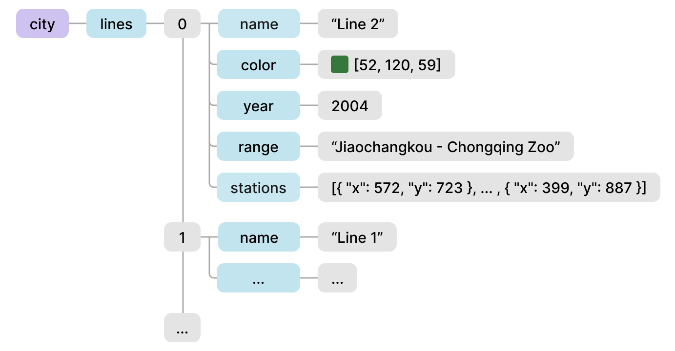 Metro lines and station data are classified by city, and their data structure is shown in Figure 4. For each metro line in each city, it includes the name, representative color, start of operation time, operating interval, and the coordinates of each station on the route.