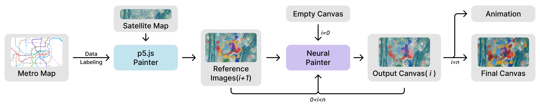 The p5.js painter labels and draws data from city metro maps onto the satellite map image of the corresponding city. The resulting generated satellite maps with data points are then used as reference images for the neural painter.