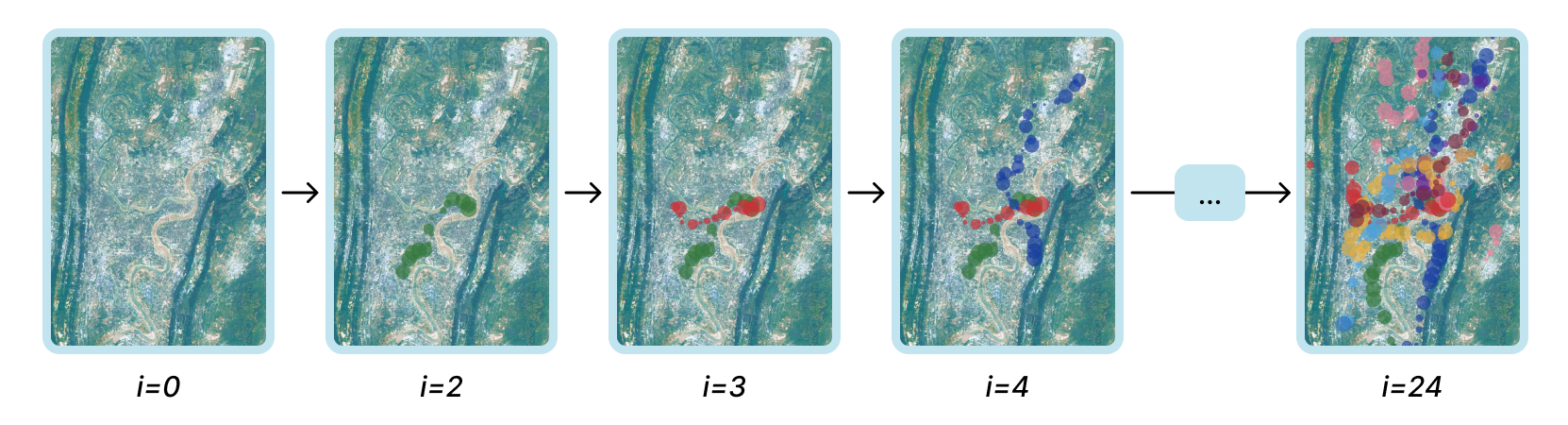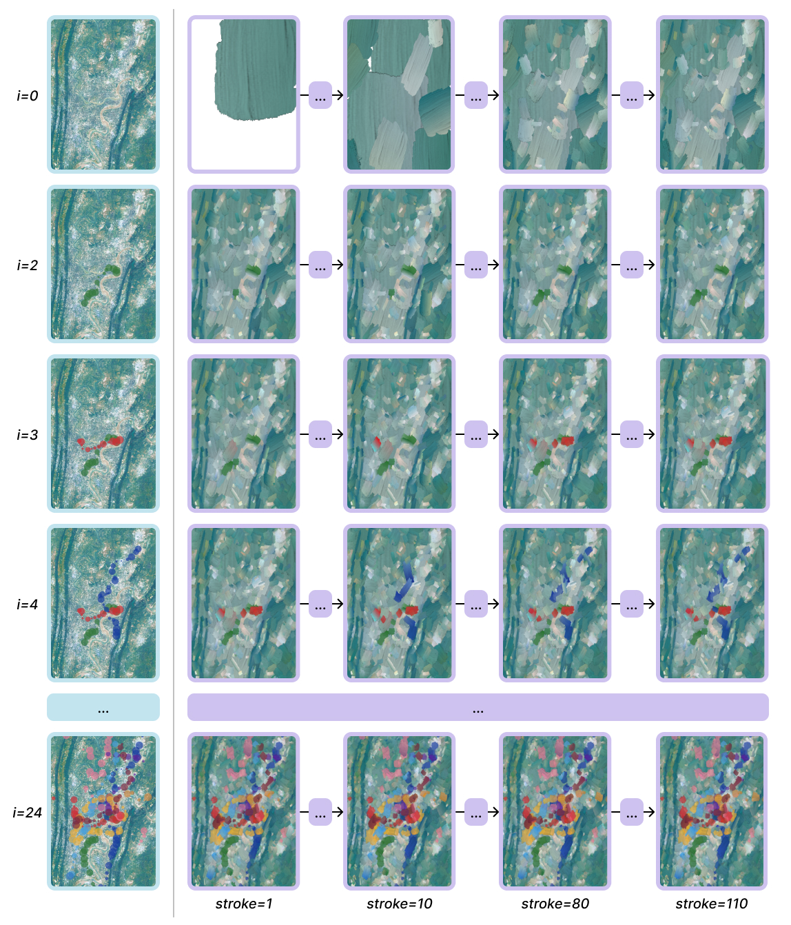 The stroke generation is completed by a neural painter which applies strokes on an virtual canvas and calculates the loss between the generated image and the reference image to update the parameters. In the stroke generation process shown in Figure 6, we started with a blank canvas and first try to paint the satellite map image, then in the next iterations, we replace the default canvas with the generated image from the previous iteration and try to paint the next reference image. This process is repeated until all the reference images have been painted.